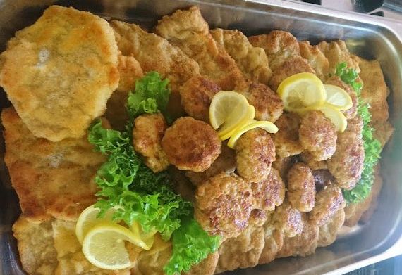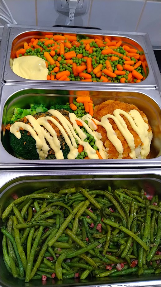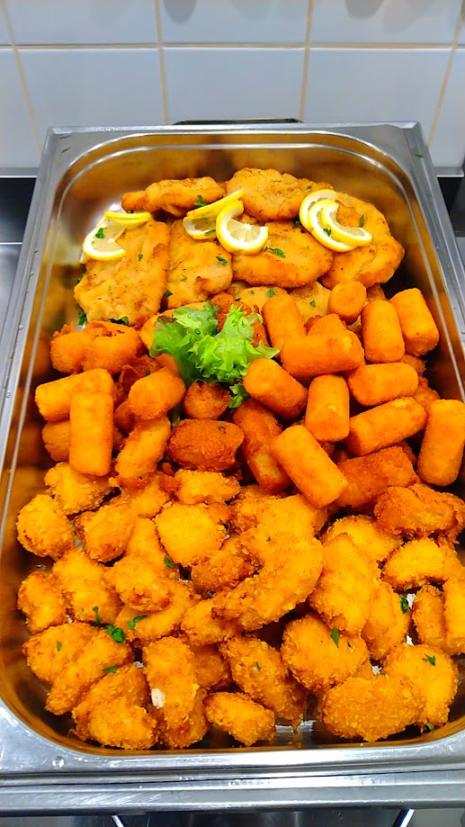 Schnitzelchen, Schweinebraten, Hähnchenschnitzel, Hähnchenkeulchen, Bouletten, Kasslerbraten, Rinderbraten, Pute überbacken, Wildspezialitäten, Gulasch, Gemüseplatten mit Möhren, Erbsen, Blumenkohl, Gemüse der Saison, Speckbohnen, Kroketten, Herzogin, Klöße, Kartoffeln, Kartoffelgratin, Nudelgratin, Gemüsegratin, Frikassee, Geschnetzeltes in Sahnesoße